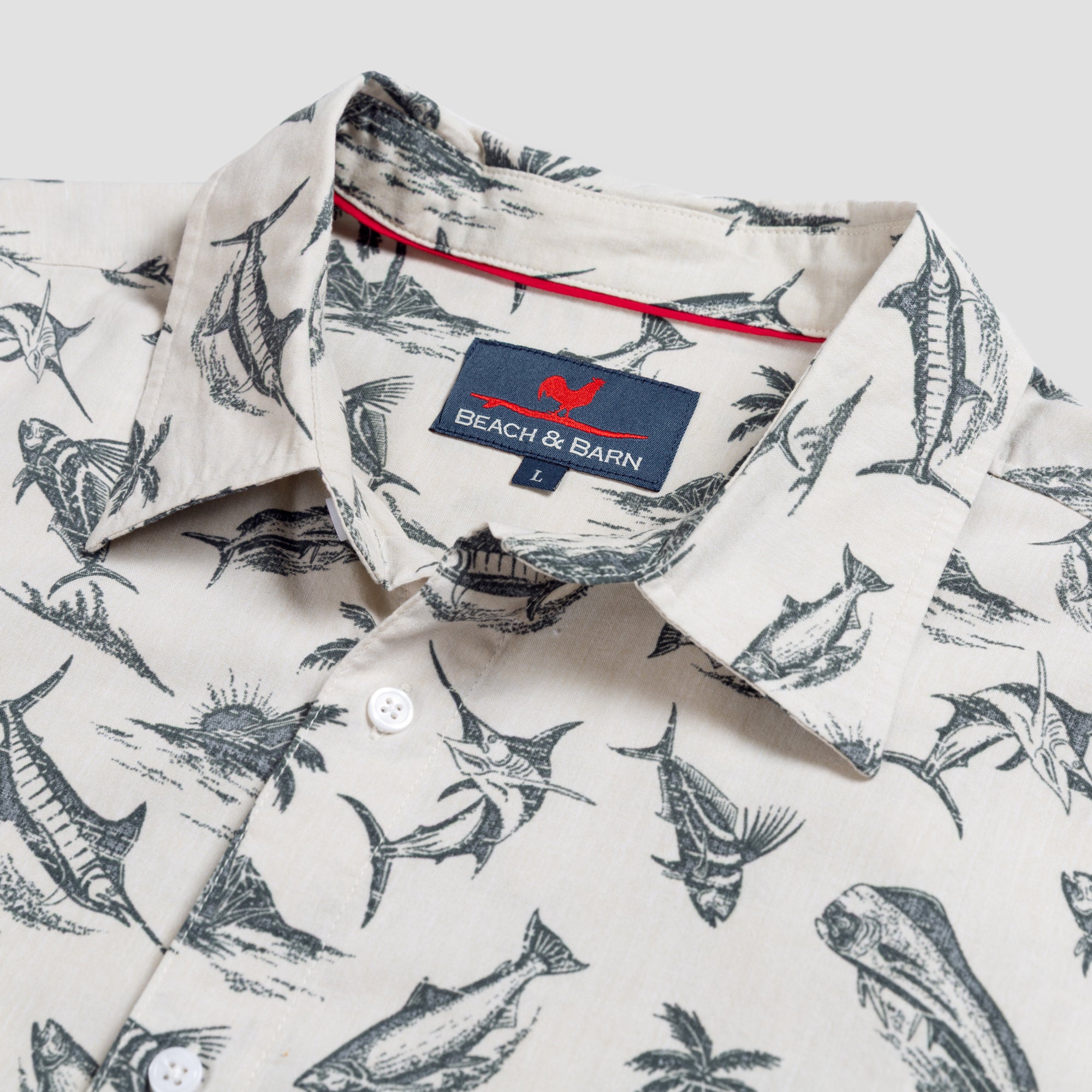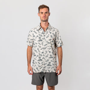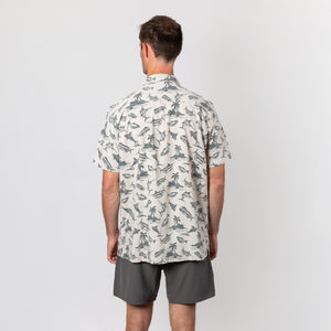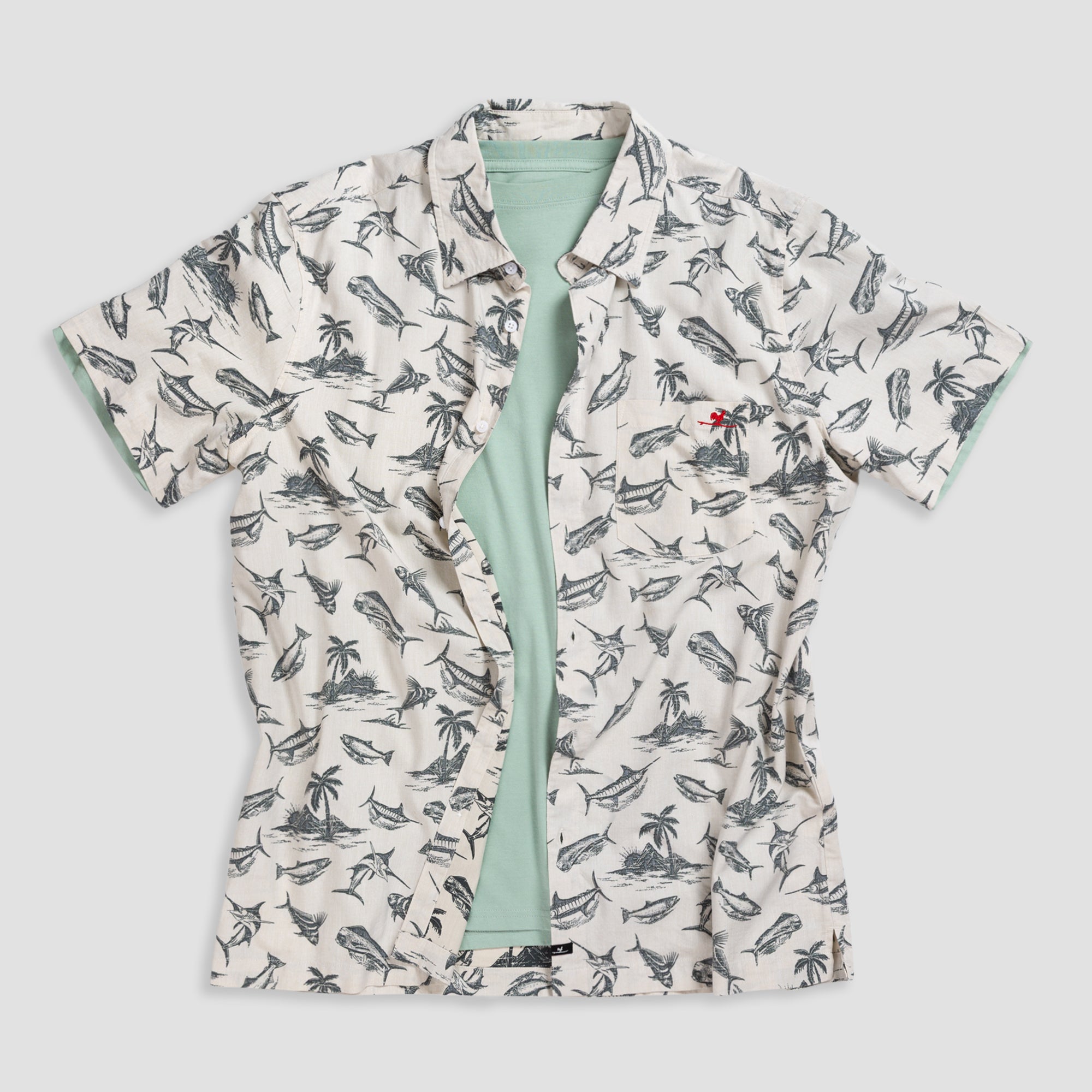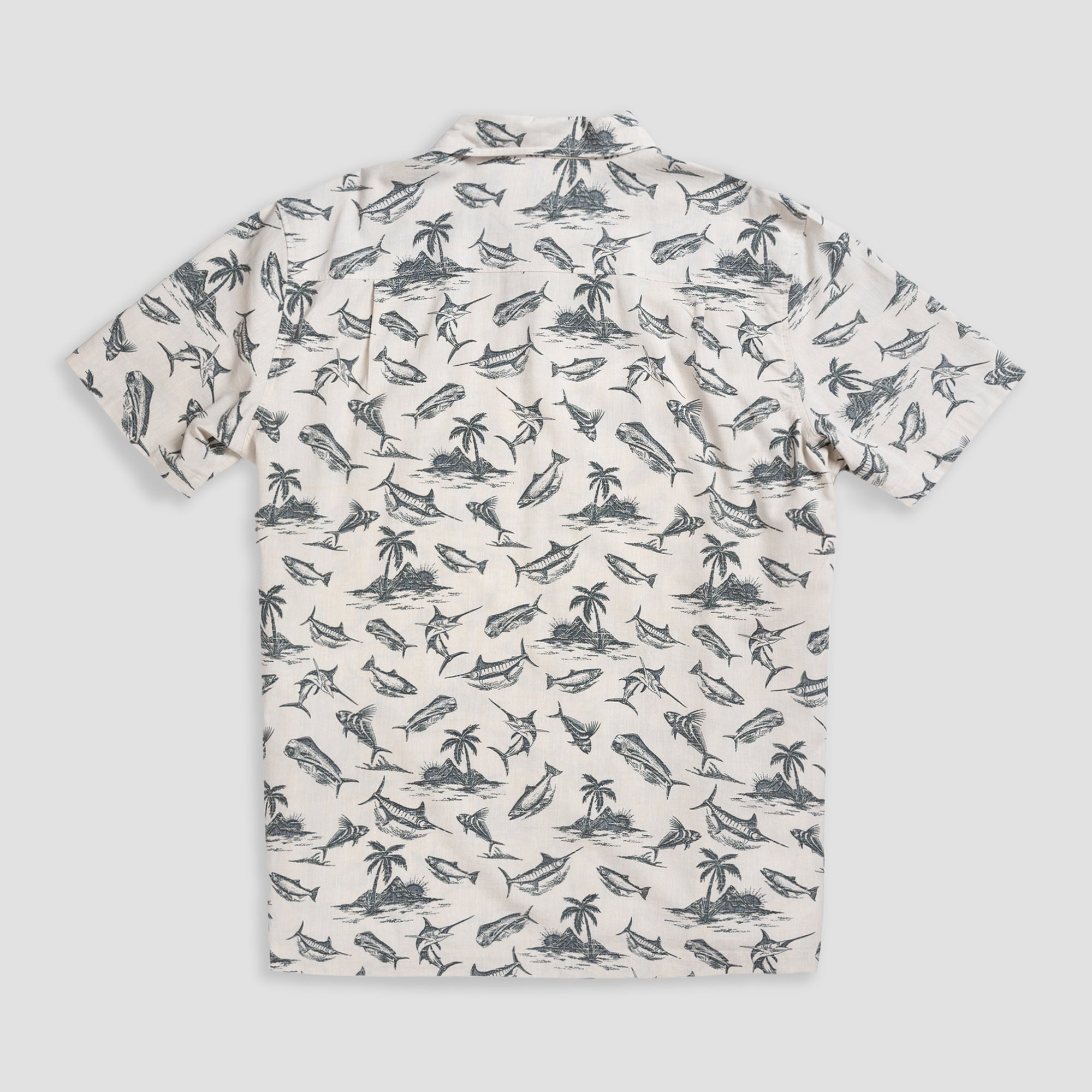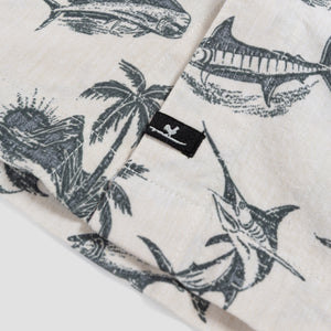 Mahi Mahi, roosterfish, a mountainous palm tree landscape, and a breaching blue marlin are all part of the colorful cast of characters that inhabit the Fish Island coastal button up shirt.
